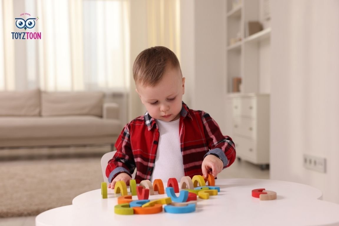 | 18–24 شهر | لعب رمزي ولفت النظر | Stacking blocks · Busy boards · Role-play sets |