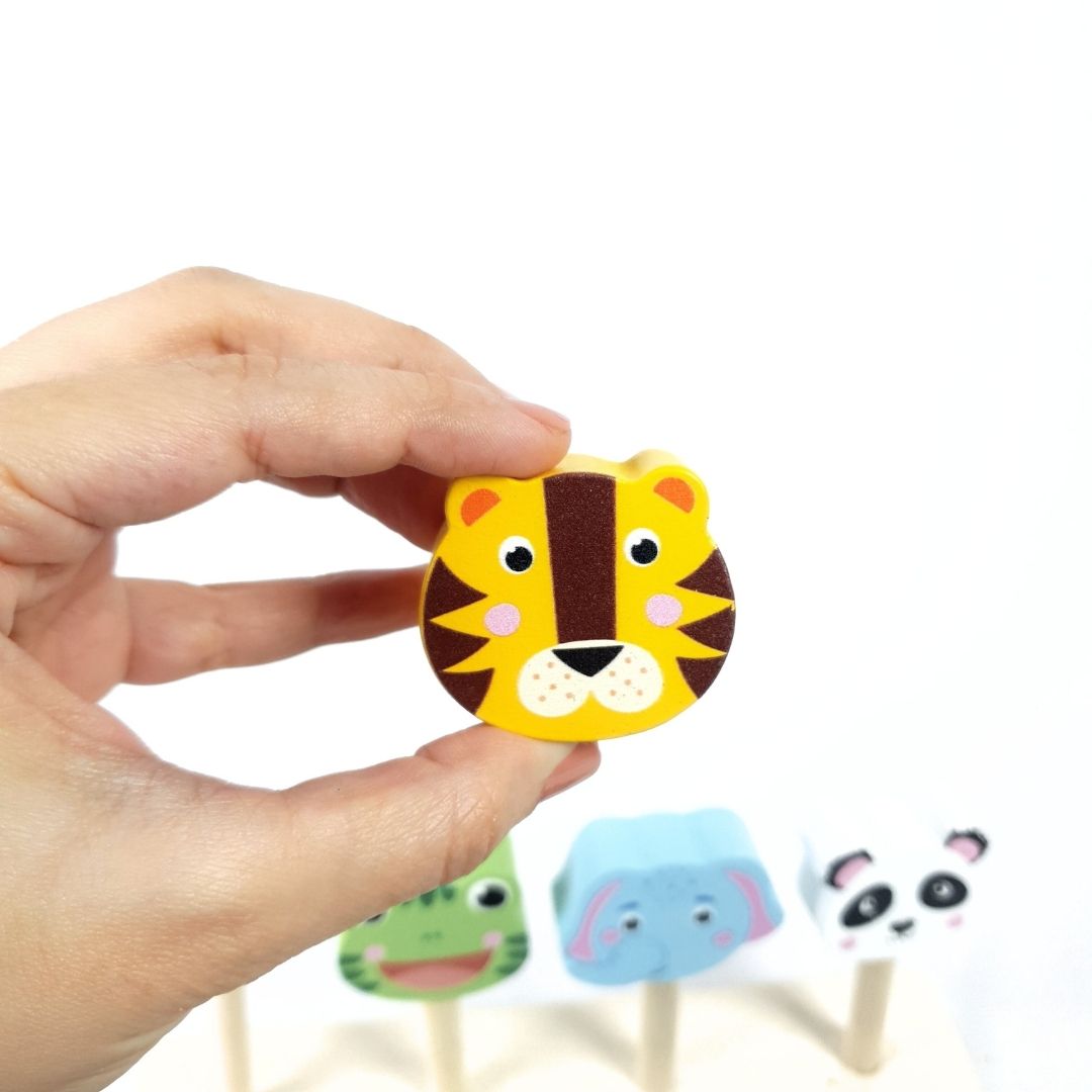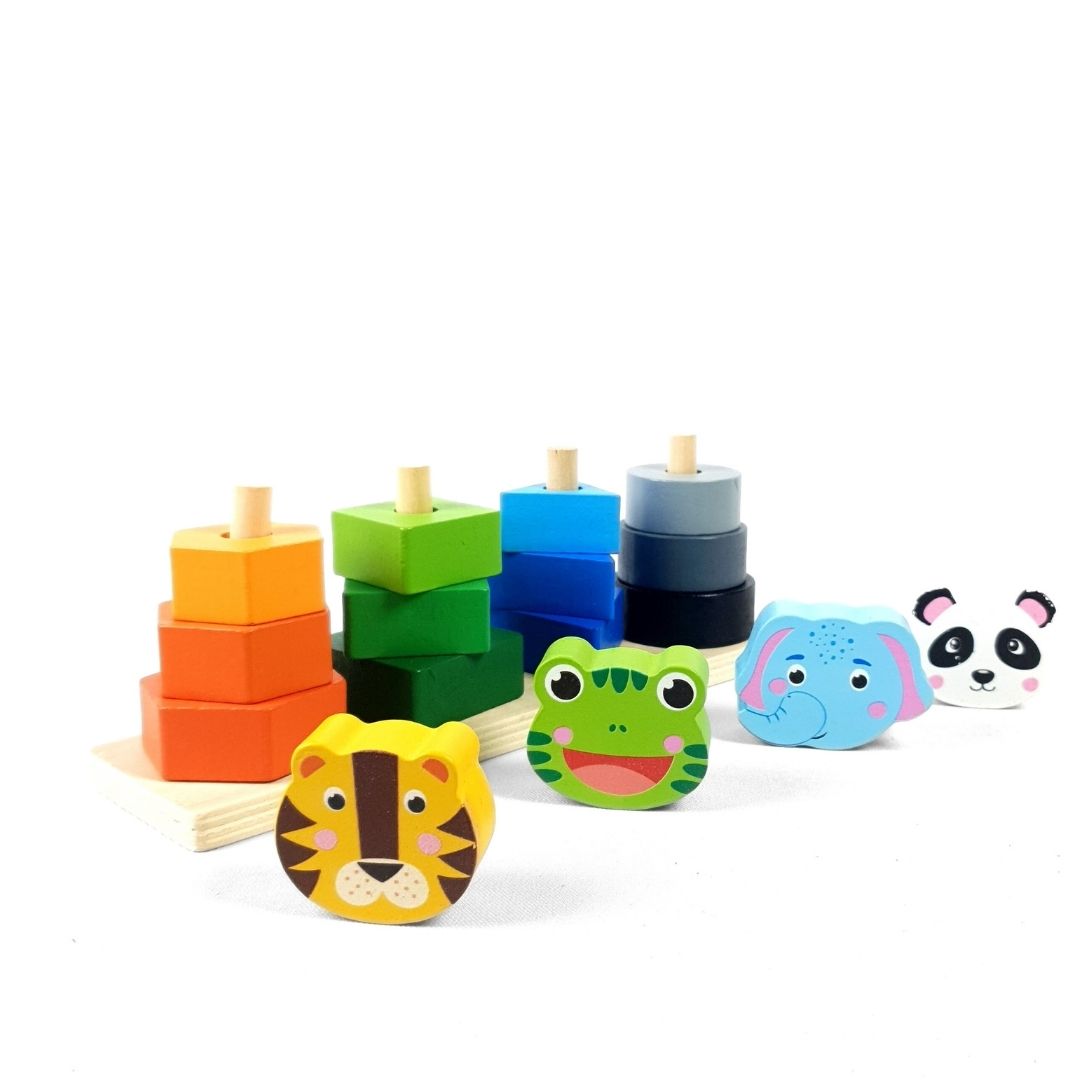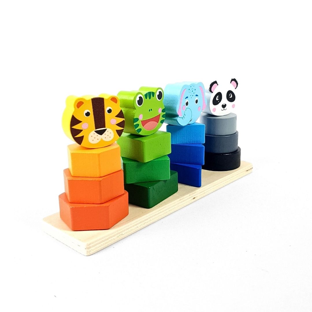 الطفل بيبدأ يركّب القطع الخشبية واحدة واحدة على العمود المناسب حسب الشكل واللون، وفي الآخر يركّب رأس الحيوان في الأعلى.