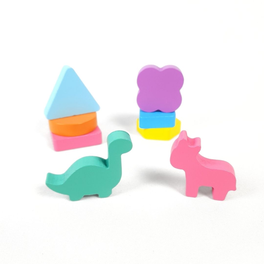 كل قطعة خشب لها شكل مميز، سواء اشكال هندسية أو حيوانات، وكل قطعة ليها كارت خاص برسمة مطابقة ليها، وده بيساعد الطفل يفهم العلاقة بين الشكل والمكان بطريقة بصرية واضحة.