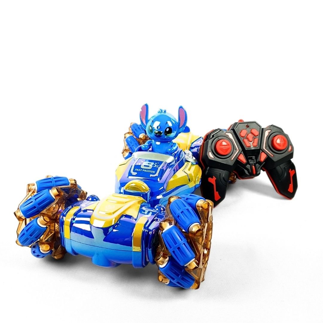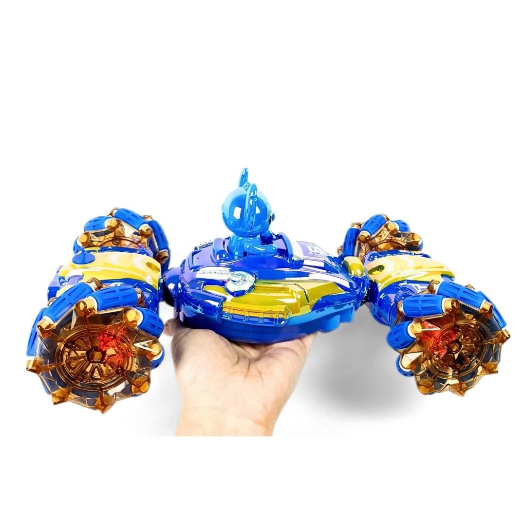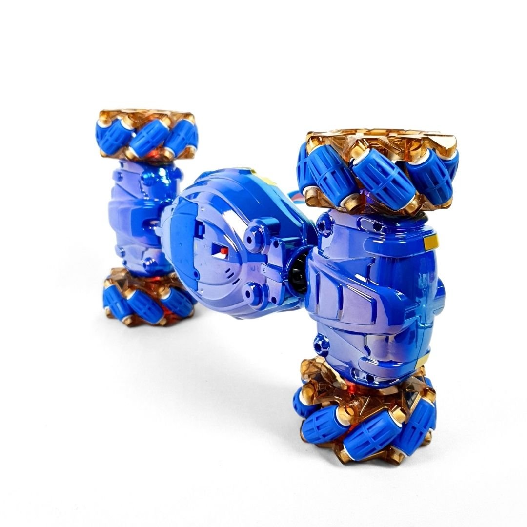 سيارة ريموت كنترول استعراضية مزودة بعجلات متعددة الاتجاهات تسمح لها بالدوران 360 درجة والحركة الجانبية بسهولة.