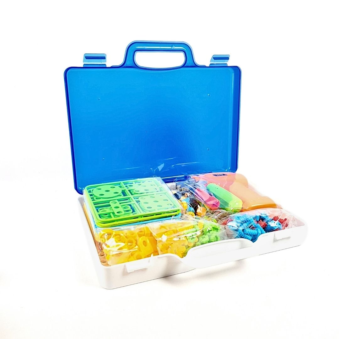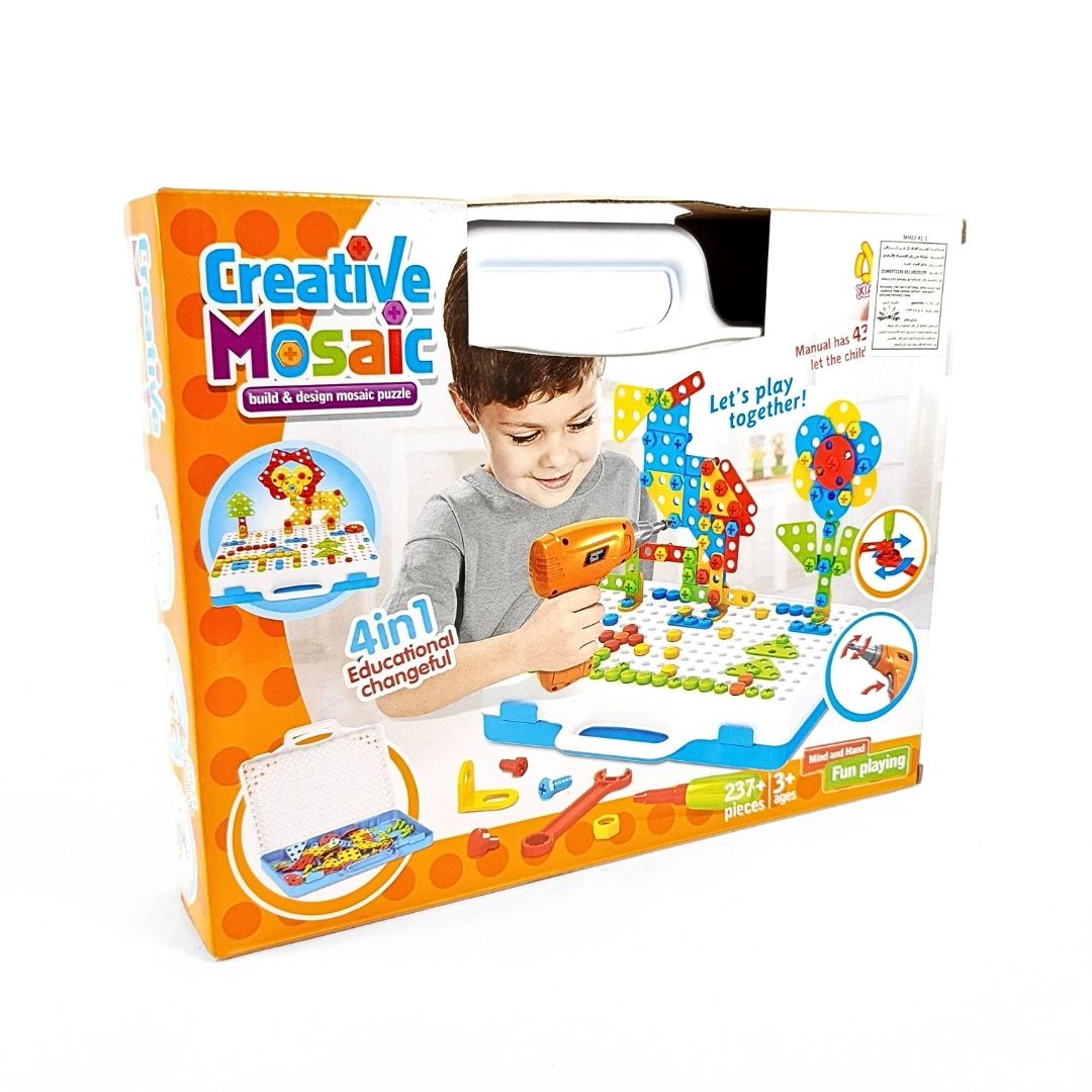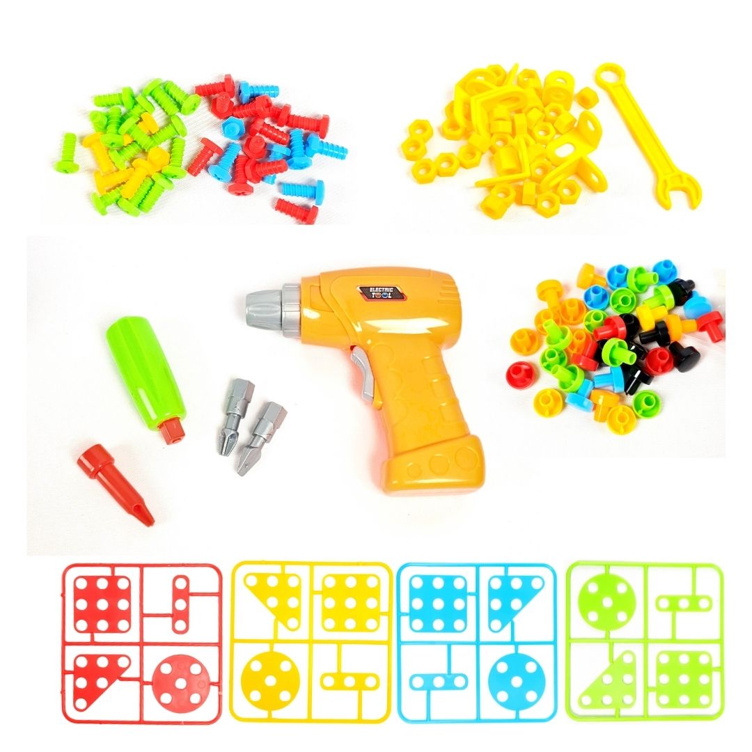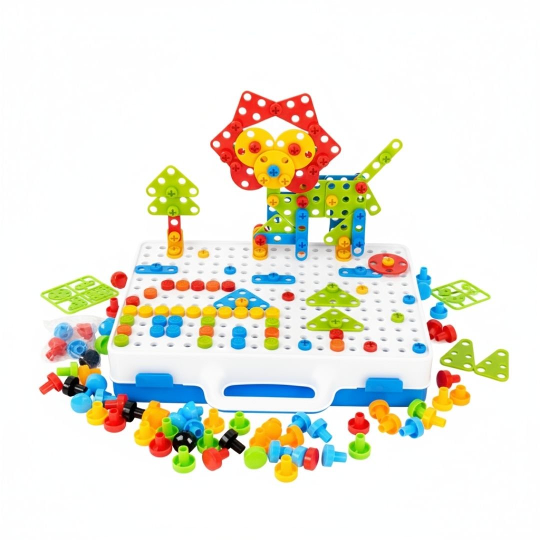 يضع الطفل القطع الملونة على اللوحة المثقبة ويستخدم المثقاب البلاستيكي أو المفك لتثبيتها بالبراغي الصغيرة.