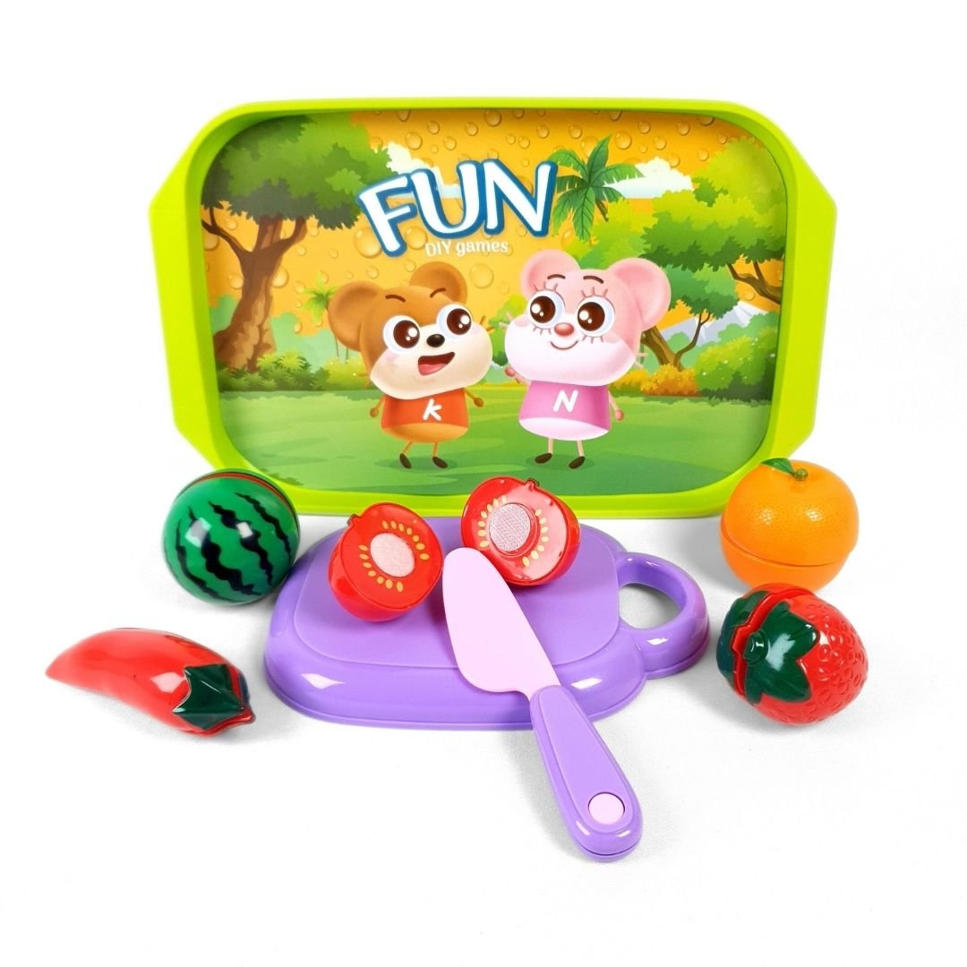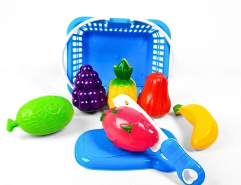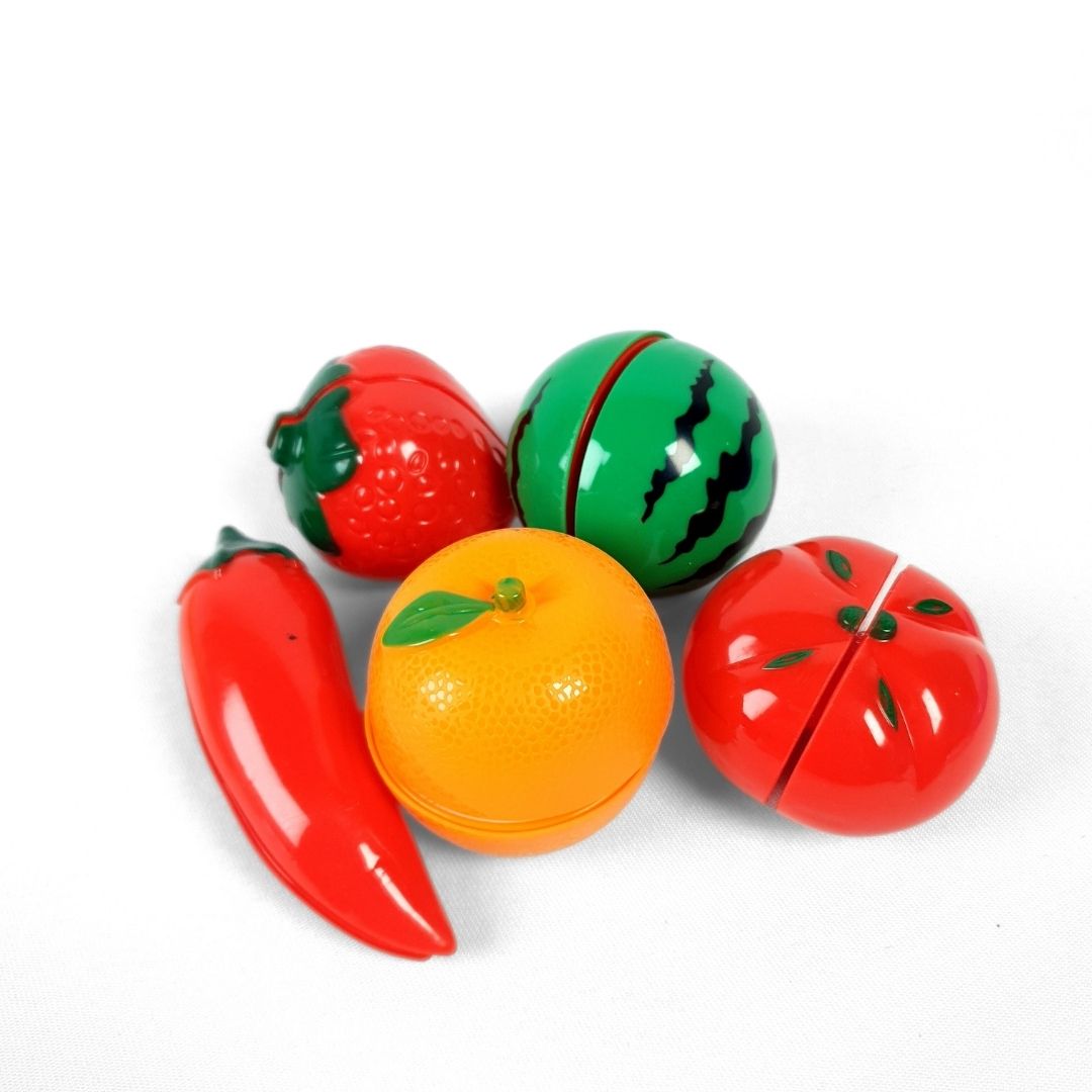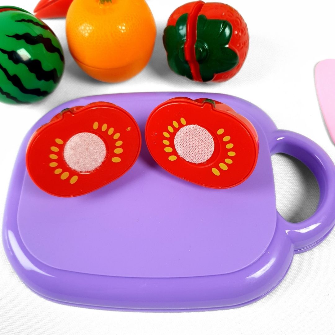 اللعبة بتتكوّن من فواكه وخضروات بلاستيك متقسمة لنصّين ومثبتة بفيلكرو من الداخل.