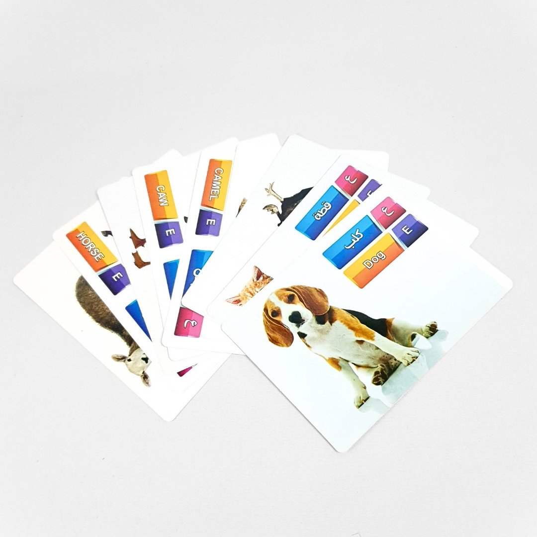 التعليم المباشر: عرض الكروت للطفل ونطق الكلمة باللغتين.