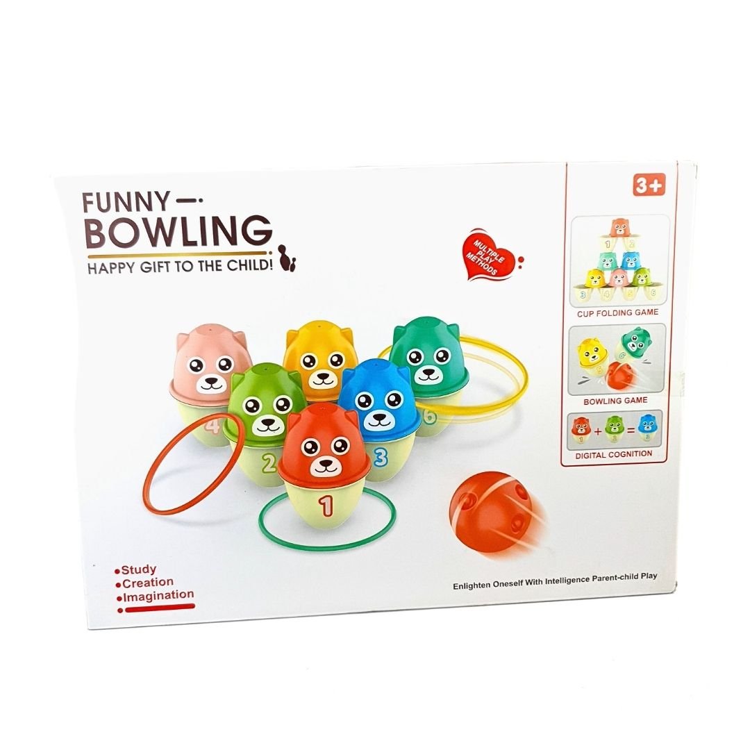 لعبة متعددة الاستخدامات تحتوي على أكواب مرقمة قابلة للتكديس، حلقات للتصويب، وكرة للبولينج.