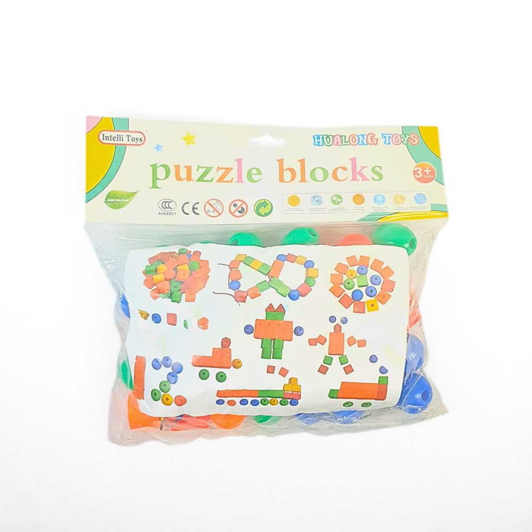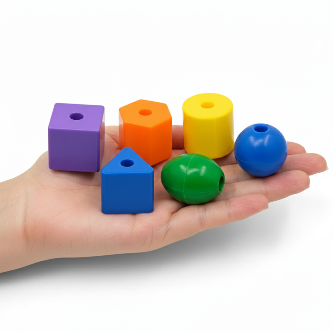 يستخدم الطفل الخيط لضم الأشكال في تسلسل حسب اللون أو الشكل.