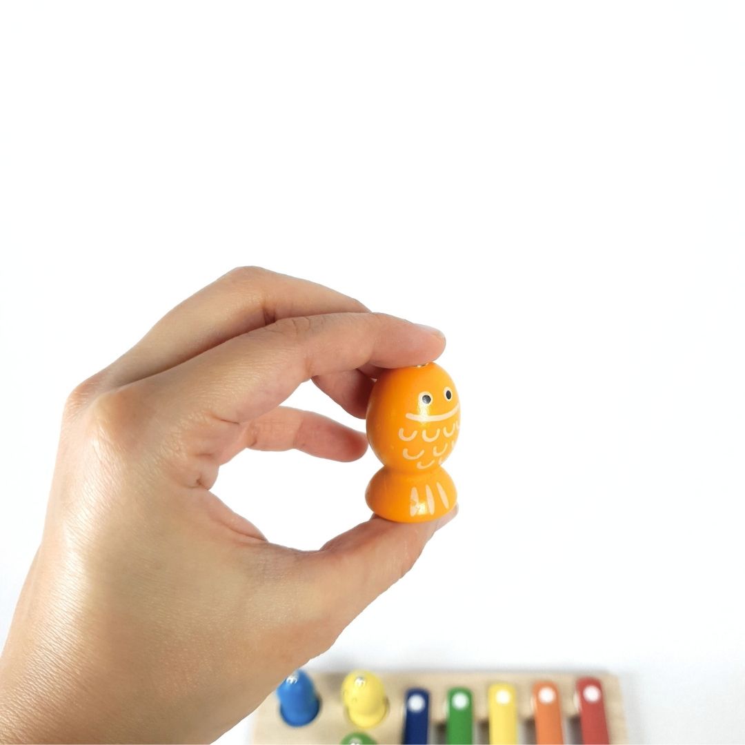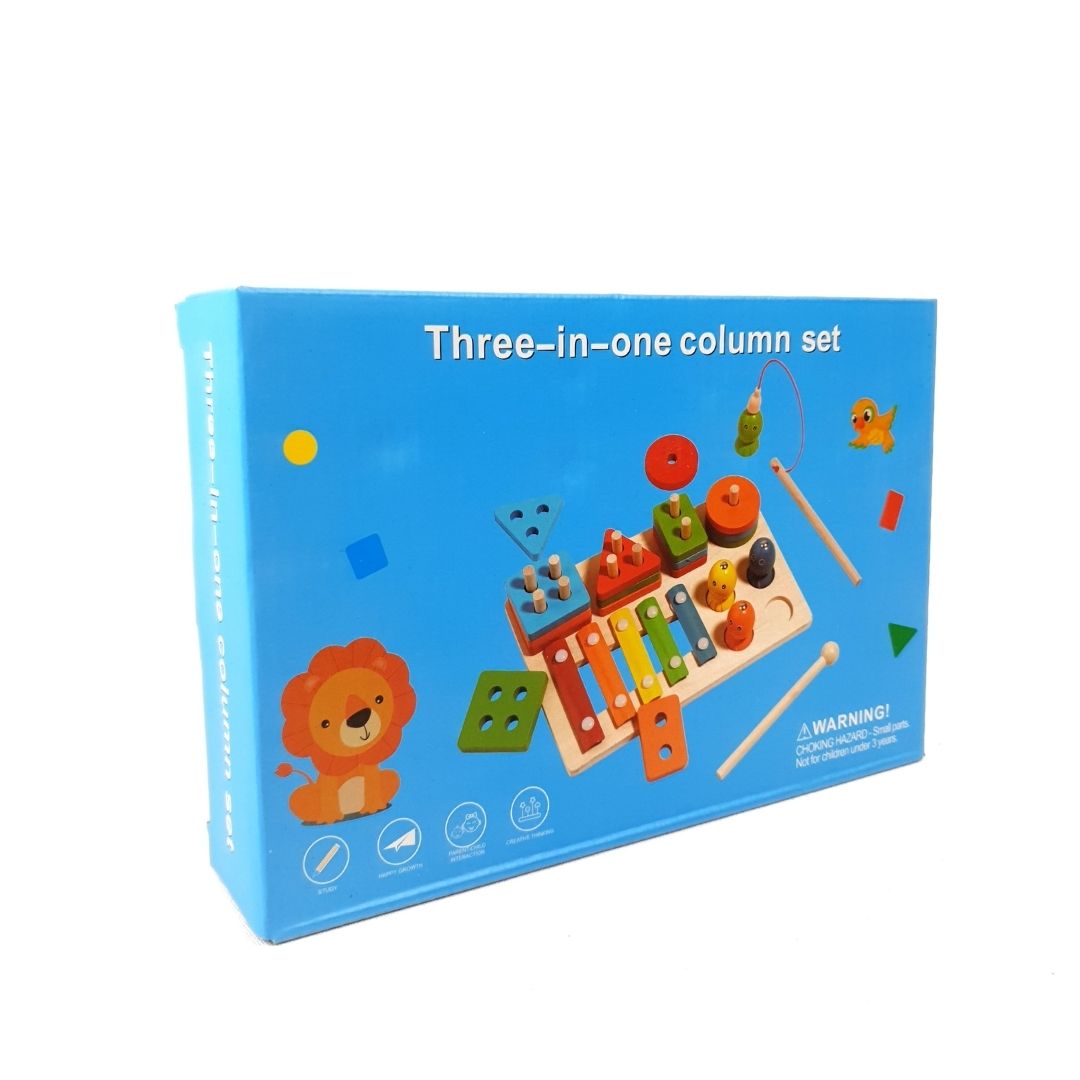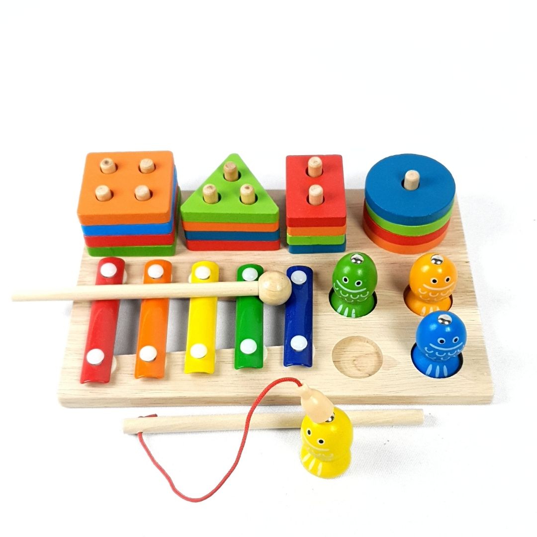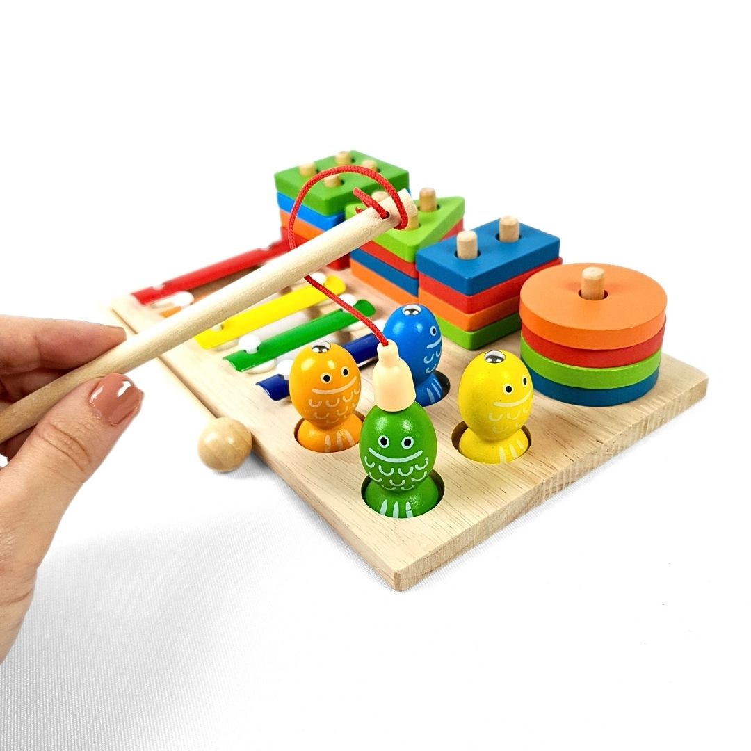 اللعبة بتجمع بين تركيب الاشكال الهندسية، العزف على مفاتيح خشبية ملونة، ولعبة الصيد بالعصاية والخيط مع شخصيات صغيرة بتتحرك وبتتمايل عند لمسها.