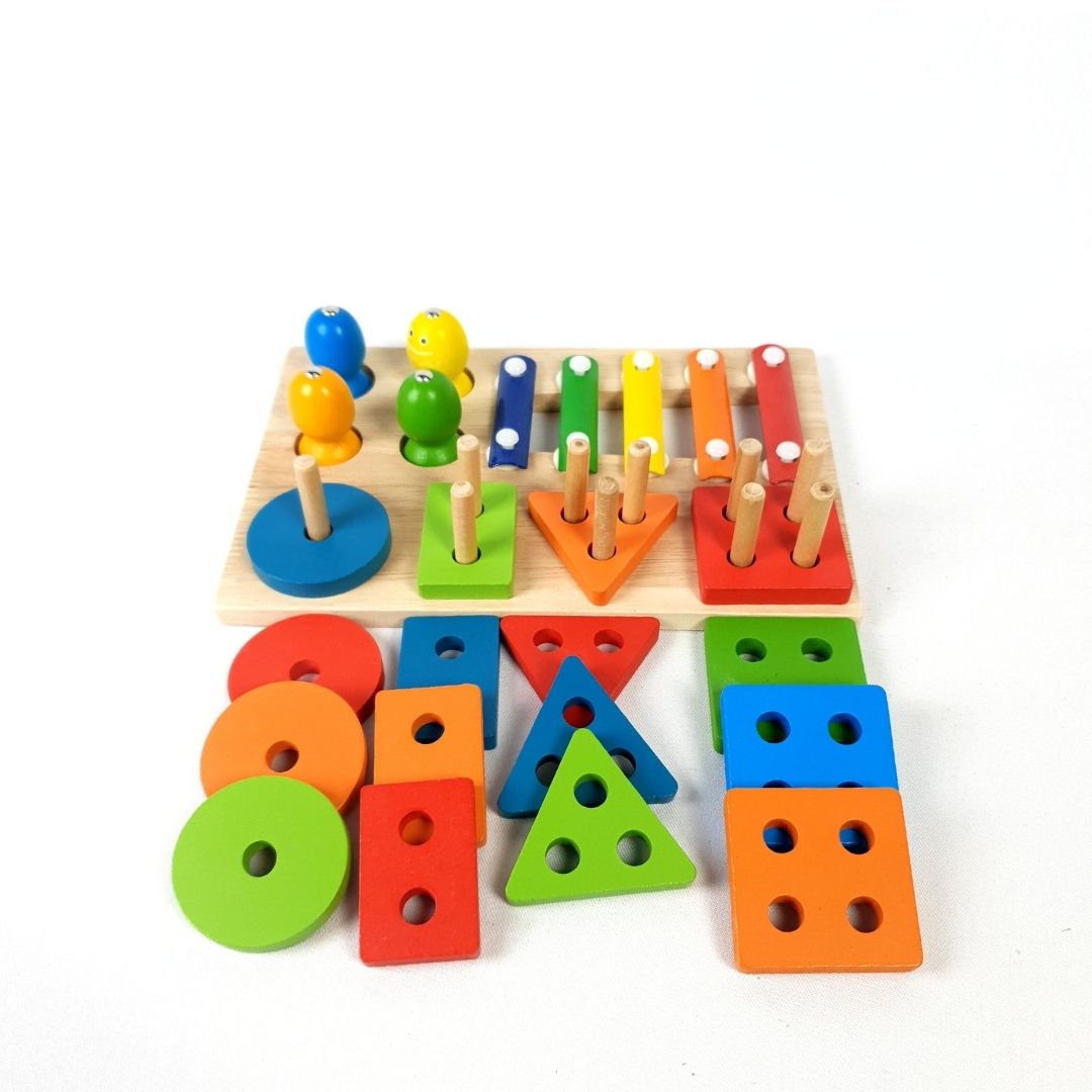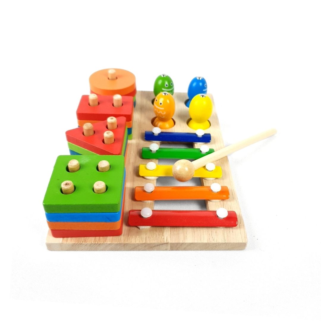 لعبة خشبية تعليمية متعددة الانشطة تجمع بين التعرف على الاشكال والالوان، العزف البسيط، واللعب الحركي، مصممة لتشجيع الطفل على الاكتشاف وتنمية مهاراته بطريقة امنة وممتعة.