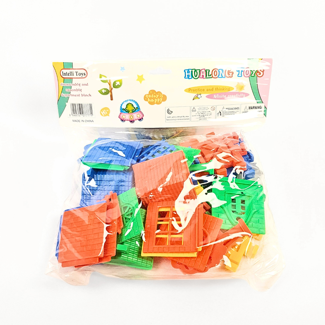 تحتوي اللعبة على قطع بلاستيك متشابكة بألوان وأشكال مختلفة (جدران – أسقف – أبواب – شبابيك – أشجار).